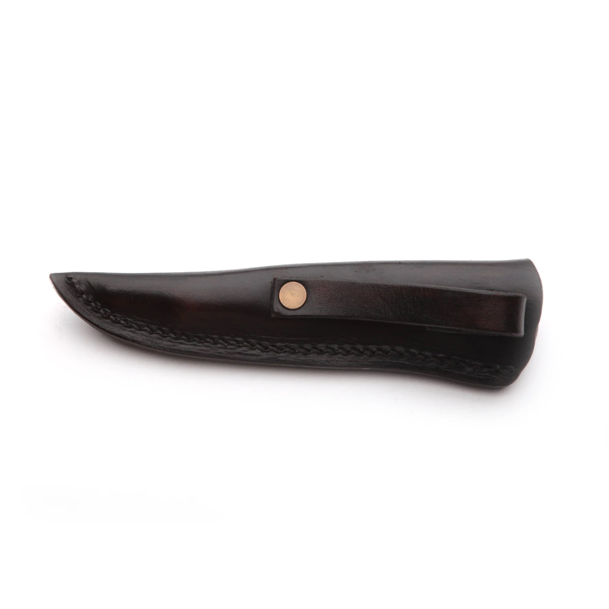 Here is a medium sheath, ideal for a small to medium utility knife. The sheath is nicely made from leather with brass rivets, has an ample belt loop on the back side, and the stitched edge of it has a spacer to provide a looser fit for wider handles.