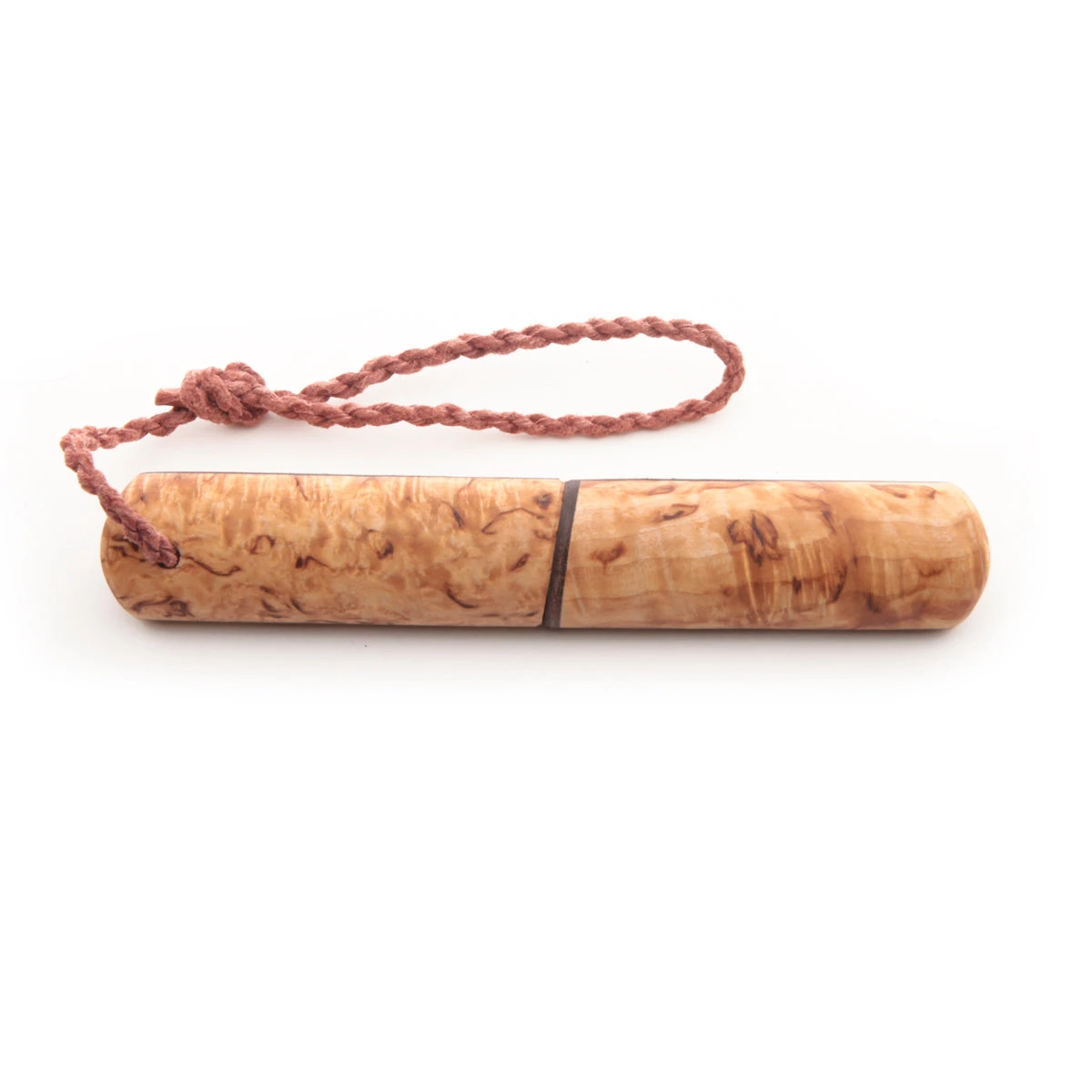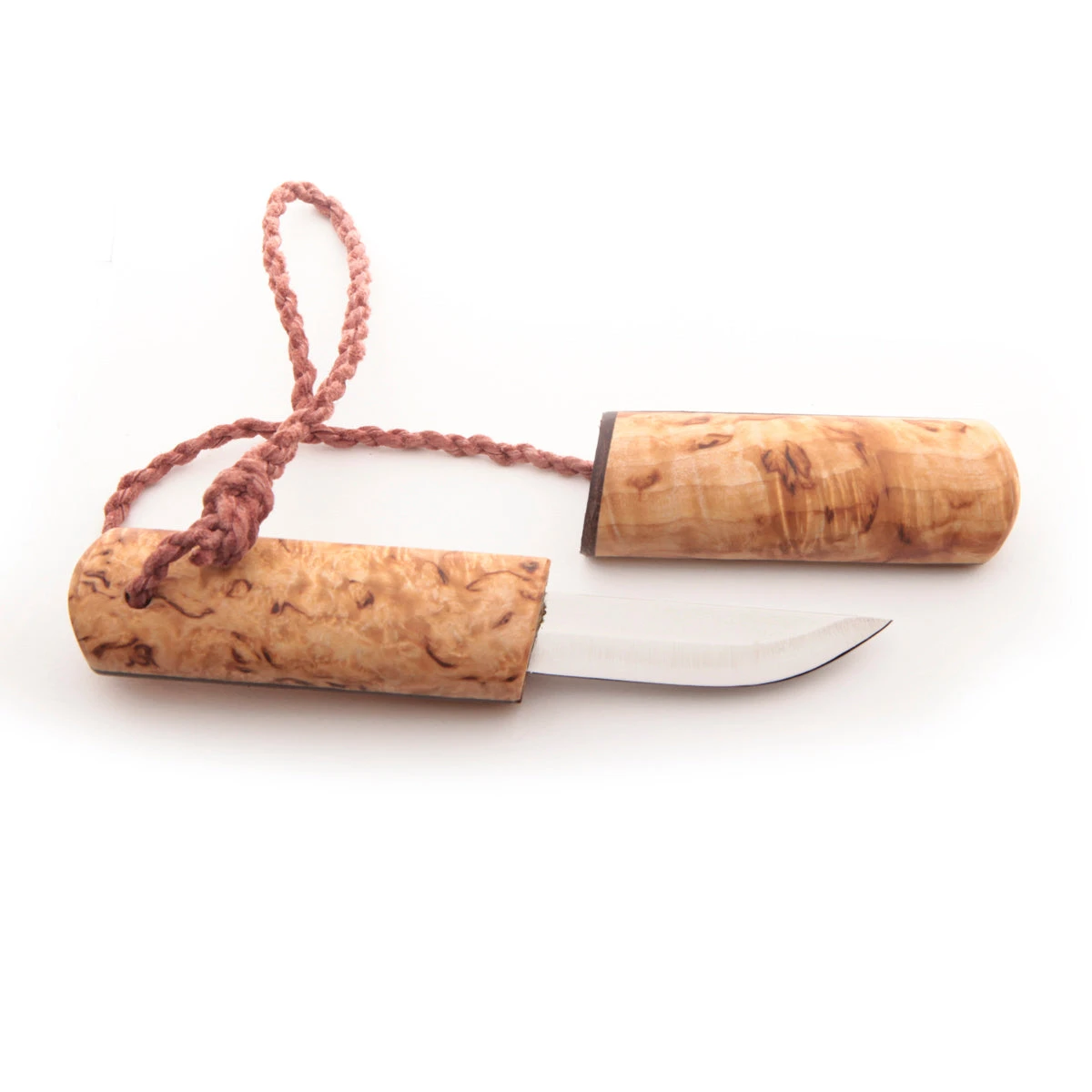 This is a delightful little package consisting of a birch-handled knife with a matching birch sheath. This would be ideal as a pocket knife or a neck knife. The blade is small but still a good size for a wide variety of tasks. There is a braided cord which connects the knife and the sheath, making sure that not only will you not lose it, but the cord slides through the knife handle to keep the sheath firmly in place on the blade. This is a very attractive product and I really like the simplicity and elegance of it.