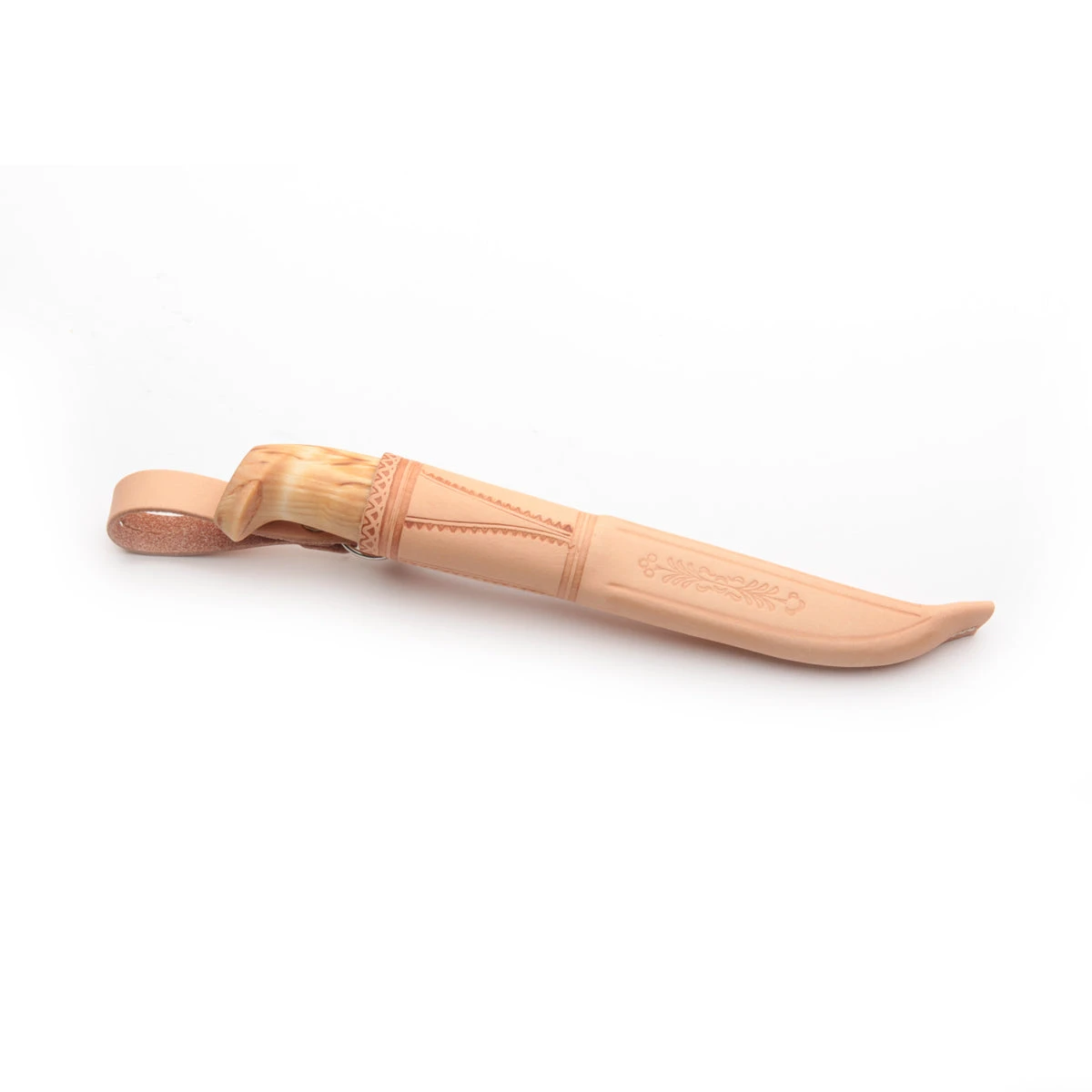 The sheath is nicely detailed with stamped and stained artwork, it contains a plastic liner to prevent the very sharp blade from slicing through, and the belt loop is attached by a metal D-ring so that it swings freely and keeps out of the way when you’re crouching or sitting.