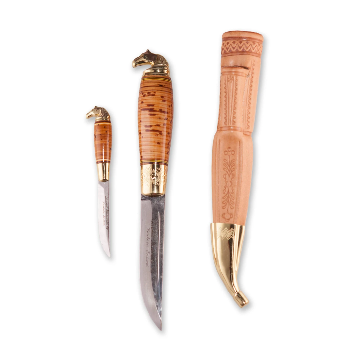 The Lappland Puukko is the traditional utility knife of the Sami people. Its design has evolved over the centuries into one of the most versatile and functional knives in existence today. This is a solid all-around camp or utility knife, featuring a long, medium-width stainless steel blade lightly inscribed with the Iisakki Järvenpää signature. This is a puukko knife with a pommel cast into a miniature horse’s head, which is a very traditional Scandinavian design. The handle is made from stacked layers of birch bark, lacquered and polished smooth.