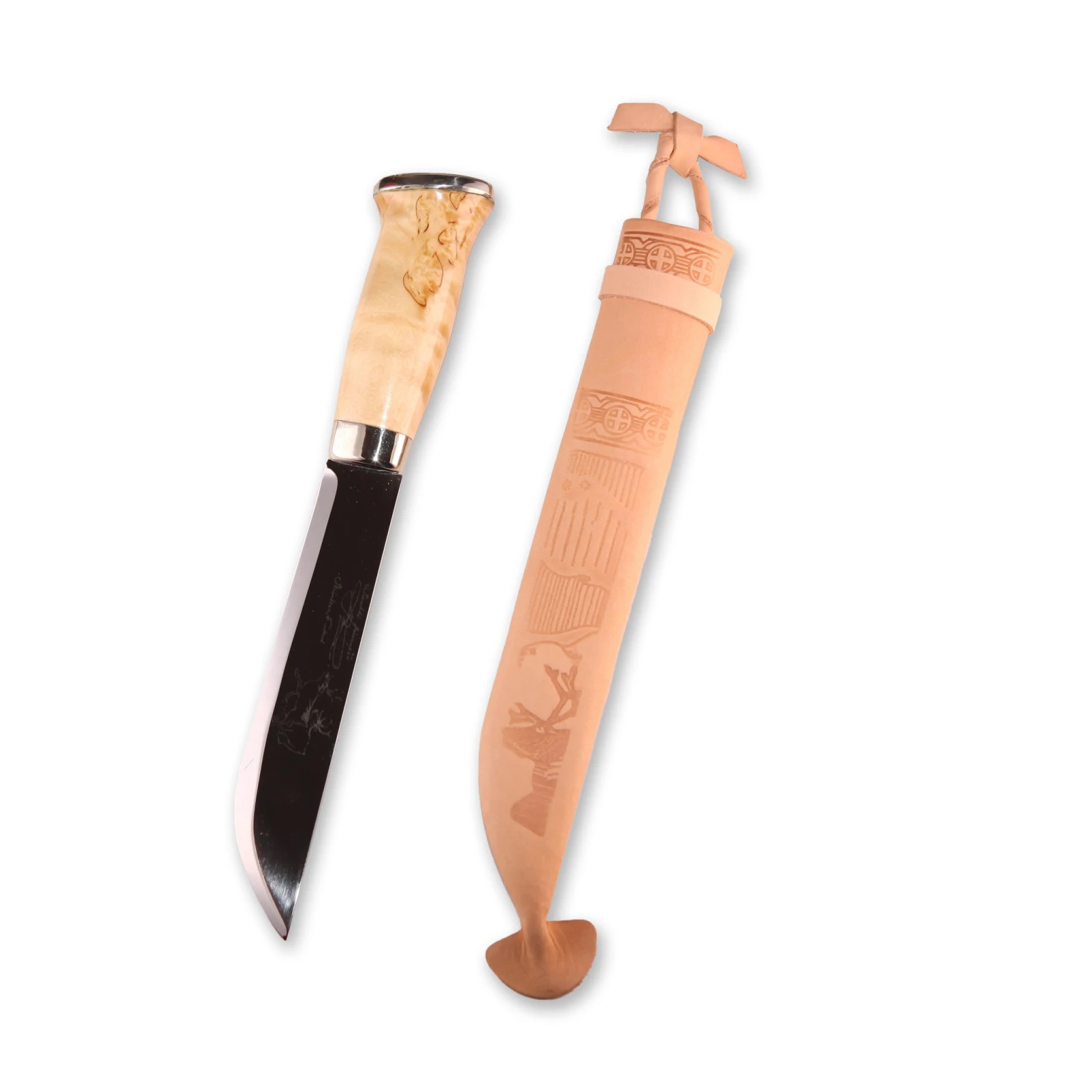 The Leuku is the traditional camp knife of the Sami, who are indigenous to the far northern region of Scandinavia. It is used for butchering game, building shelter, skinning, and chopping wood. These are large, serious knives designed for serious wilderness chores. The blade is lightly inscribed with the Iisakki Järvenpää signature. When you hold this knife in your hand, you can feel the solid construction and high quality. The handle is made from curly birch wood, lacquered and polished to a smooth finish, and has a flared pommel to prevent the knife from slipping out of your hand.