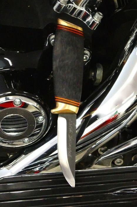 The Tramp is a very attractive, solid-feeling knive with a wide carbon steel blade. The brass fittings form a guard and a bit of a hooked pommel to prevent the knife from slipping out of your hand. The handle is stained wood, polished smooth and much wider than usual, sized for larger hands and offering a firm grip. The blade is lightly inscribed with the Iisakki Järvenpää signature. The full-length tang can be seen within the brass butt plate on the pommel, giving this knife added durability. When you hold this knife in your hand, you can feel the solid construction and high quality.