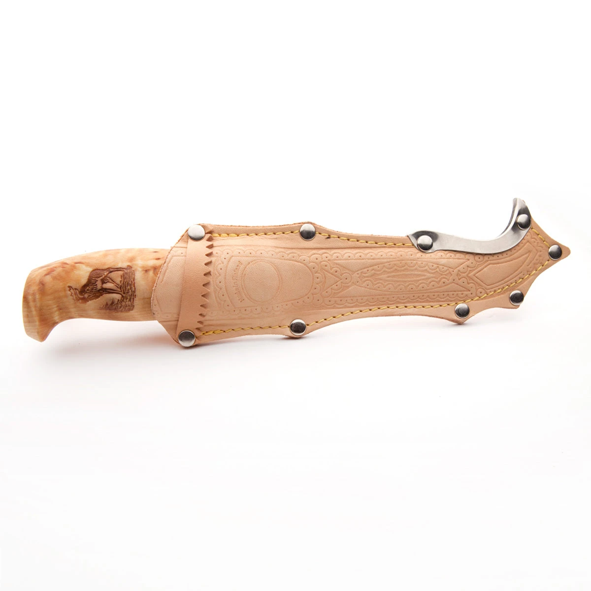 The Vuolu has a longer carbon steel blade, which would be useful when butchering large game. The handle is formed into a guard in the front and a hooked pommel in back, providing a very secure grip even when your hands are wet and slippery. The handle has a burnt image of an elk, and is sanded and polished to a soft, smooth finish. The full-length tang is evident by the brass nut on the pommel, giving this knife added durability. The blade is lightly inscribed with the Iisakki Järvenpää signature. The knife is surprisingly lightweight, which reduces hand and wrist fatigue if you’re using it for a long time.