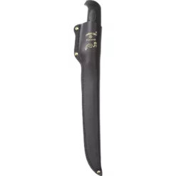 The sheath is nicely detailed with stamped artwork, in the flat style with stitching and rivets up the sides. Please note that this knife comes with the lighter-colored sheath shown in the picture.