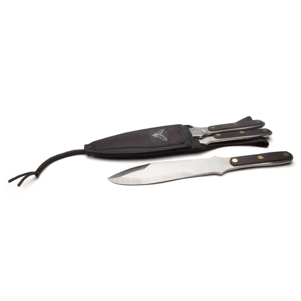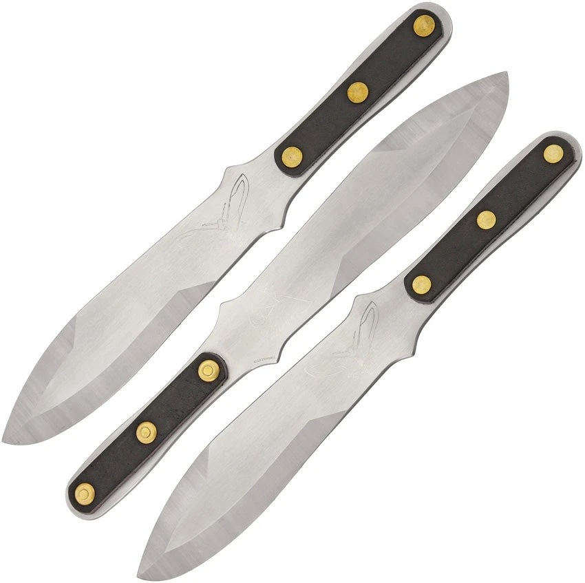 This is a 3-pack of a large, heavy throwing knives. The extended length (almost 14″) and heavier weight (almost a full pound!) insure a smooth, consistent rotation. The lack of a hook at the end of the handle helps with a smooth release: just loosen your grip and let it slide out of your hand. It’s about 50% thicker than your average throwing knife (0.17″ as opposed to the usual 0.13″), which gives your hand more circumference to grip onto, and then there is leather riveted onto each side, creating a handle circumference that is approaching the size of most non-throwing knives. The blade profile has generous leading and trailing edges, so the knife will still stick in the target if it is under- or over-rotated. If you watch what the veteran throwers are using, most of them use a larger, heavier knife like this. This is one of the finest throwing knives that we have ever found, and we’re very proud to offer this to our fellow throwing enthusiasts.