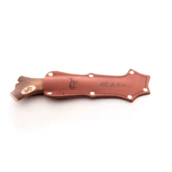 This knife is a good choice for those who want a solid, dependable everyday knife at a good price. The blackened cabron steel blade is paired with a tar-stained wooden handle which is stamped with the Marttiini logo. The stamped black leather sheath is a traditional scandinavian deep pouch style, stitched up the back, and has a twisted leather cord to securely attach it to your belt while allowing more flexibility of movement than a more rigid belt loop. Â