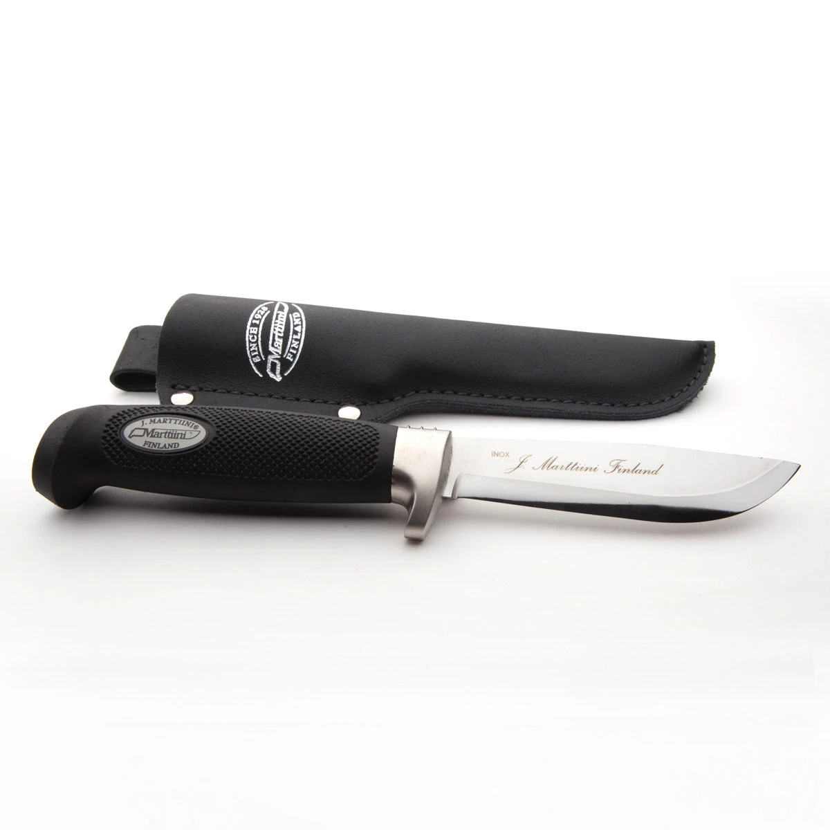 Comes with a nicely constructed leather sheath featuring the Marttiini logo printed in silvery ink, and it contains a plastic liner to prevent the very sharp blade from slicing through.