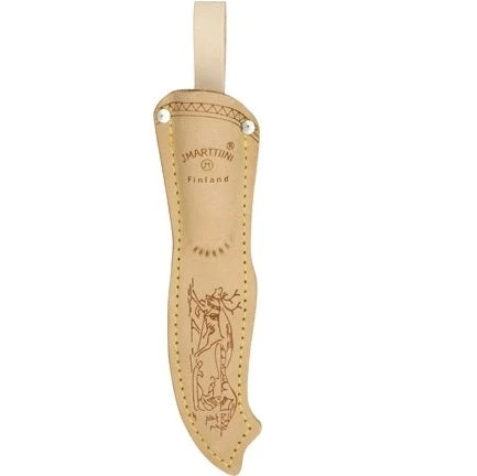 The blade of this knife is inscribed with the Marttiini signature, is nicely polished and features a drop-point profile which levels off at the tip. The riveted flat leather sheath, nicely detailed with a stamping of a dog sled, perfectly complements the lightly lacquered curly birch handle. The handle features a strong pommel hook to help retain a firm grip during draw cuts.