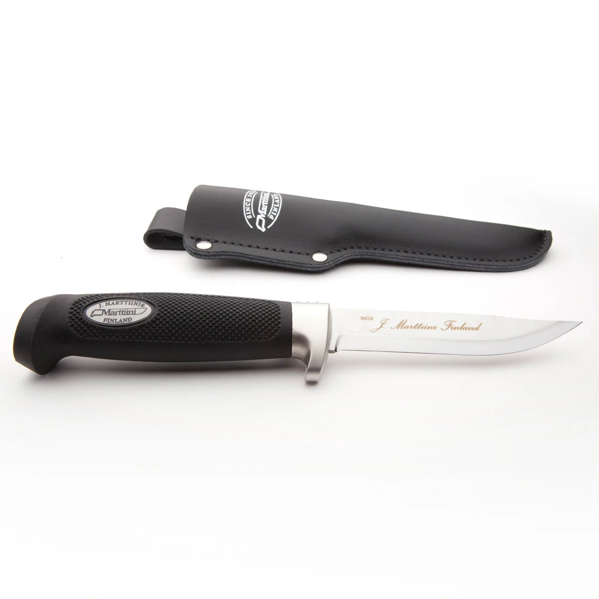 Comes with a nicely constructed leather sheath featuring the Marttiini logo printed in golden ink. The sheath contains a plastic liner to prevent the very sharp blade from slicing through.