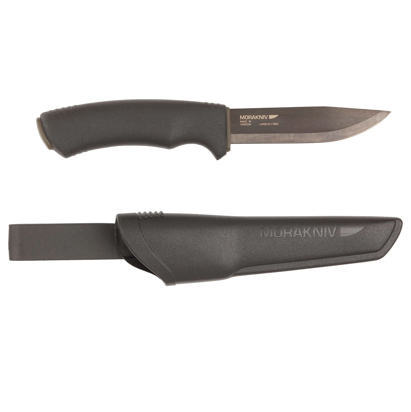 The Bushcraft Black has a well-balanced, solid carbon steel blade with drop-point profile, and the blade is black to suppress reflections. The back of the blade has hard edge for use with a striker or fire steel. The knife click-locks securely into the sheath, and the handle has a curved and hooked design to provide a solid, firm grip. The sheath comes with both a swivel-style belt loop and a rigid belt clip (you’ll get both and can attach either according to your preference).
