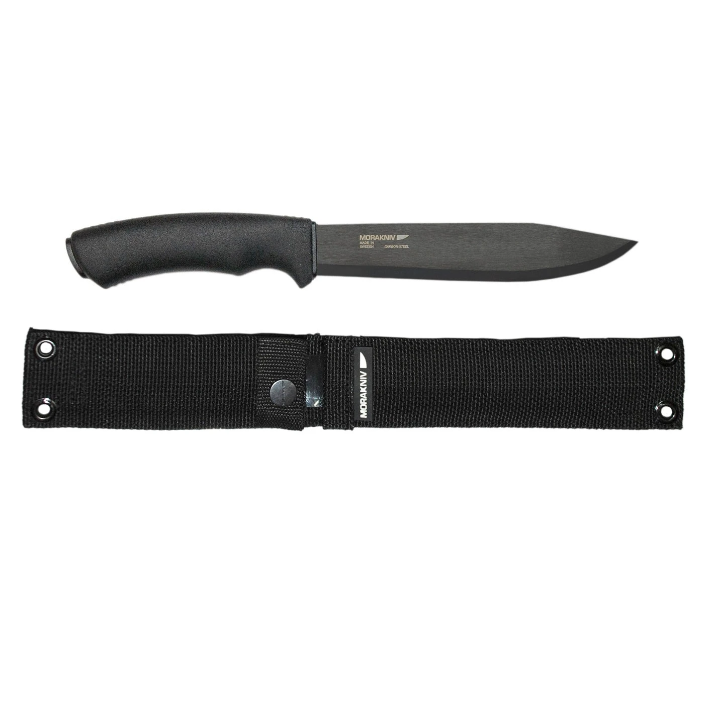 The Bushcraft Pathfinder is a serious, large, heavy-duty bushcraft knife. It’s almost a foot long, and the carbon steel blade is over an inch wide and is blackened to prevent reflections and corrosion. The sheath is nylon and has a plastic insert, to protect both the sheath and the hand from this very sharp knife. The sheath is also compatible with MOLLE (Modular Lightweight Load-carrying Equipment, which is a standard defined for use by many NATO militaries). However, the sheath does not have a belt loop.
